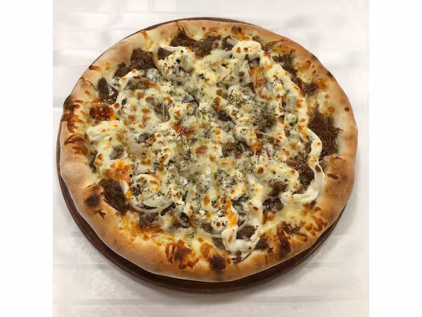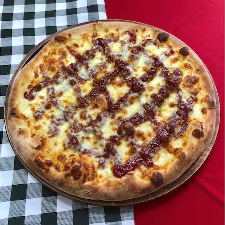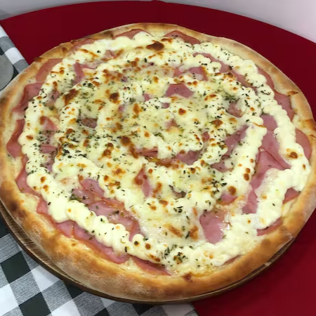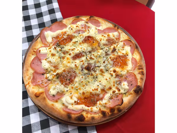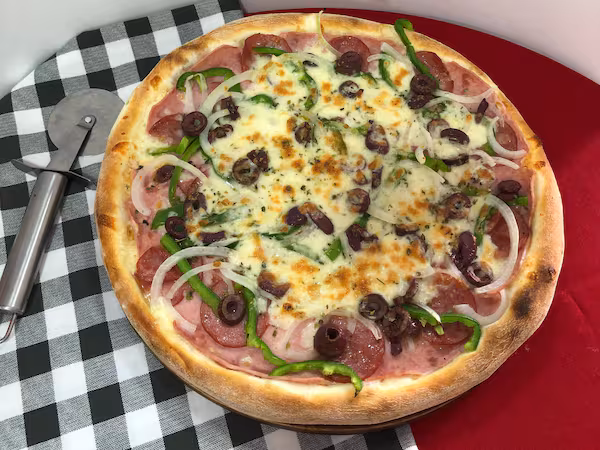 Molho ao sugo, muçarela, presunto, calabresa, pimentão, cebola, azeitona preta e orégano.