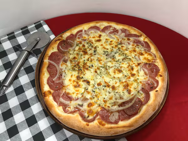 Molho ao sugo, muçarela, calabresa, cebola e orégano.