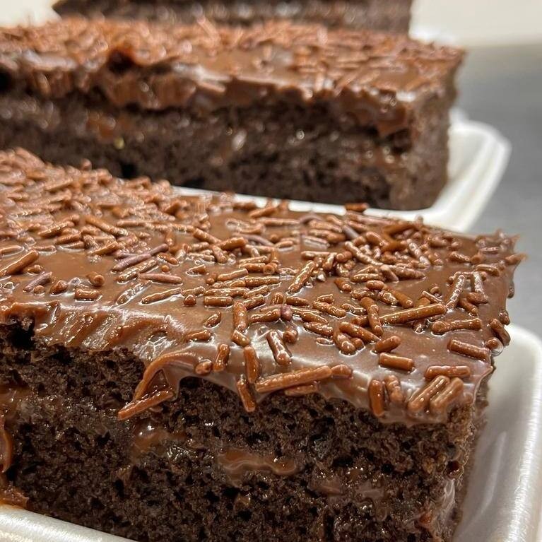 Delicioso bolo artesanal recheado e coberto com chocolate. Ingredientes: açúcar, margarina, amido de milho, chocolate em pó, ovos e leite, leite condensado e chocolate.