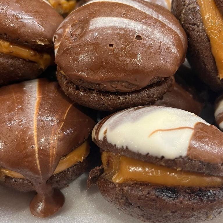 Pão de mel recheado com doce de leite e coberto com chocolate ao leite.