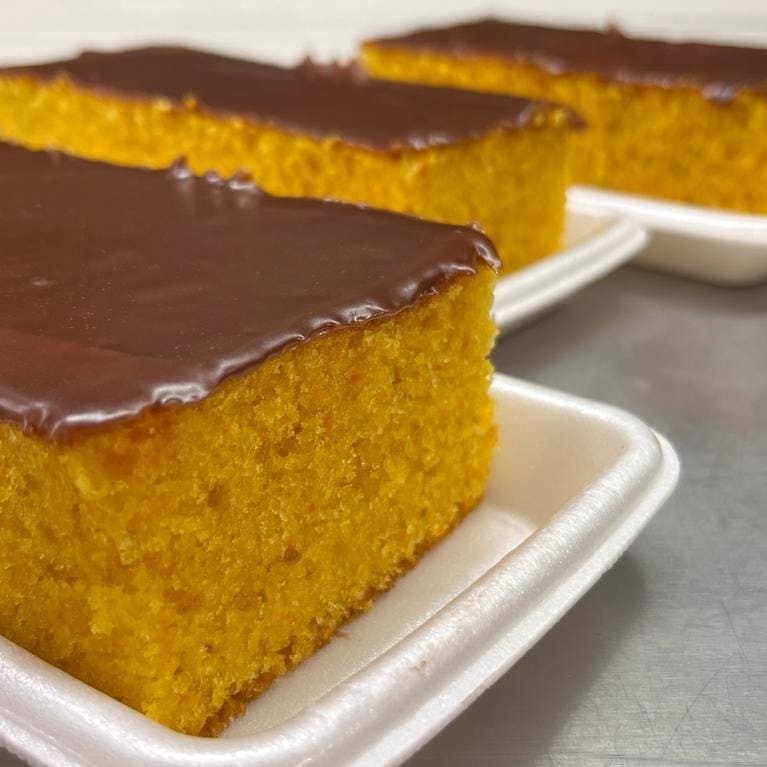 Delicioso bolo de cenoura artesanal com cobertura de chocolate. Ingredientes: açúcar, margarina, farinha de trigo, cenoura, chocolate, óleo, ovos e leite.