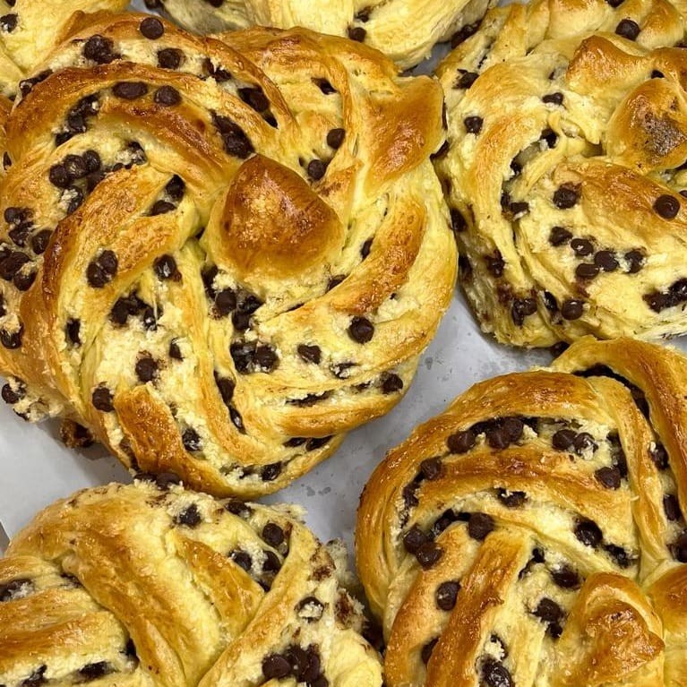 Deliciosa rosca caseira, recheada com gotas de chocolate e coco.