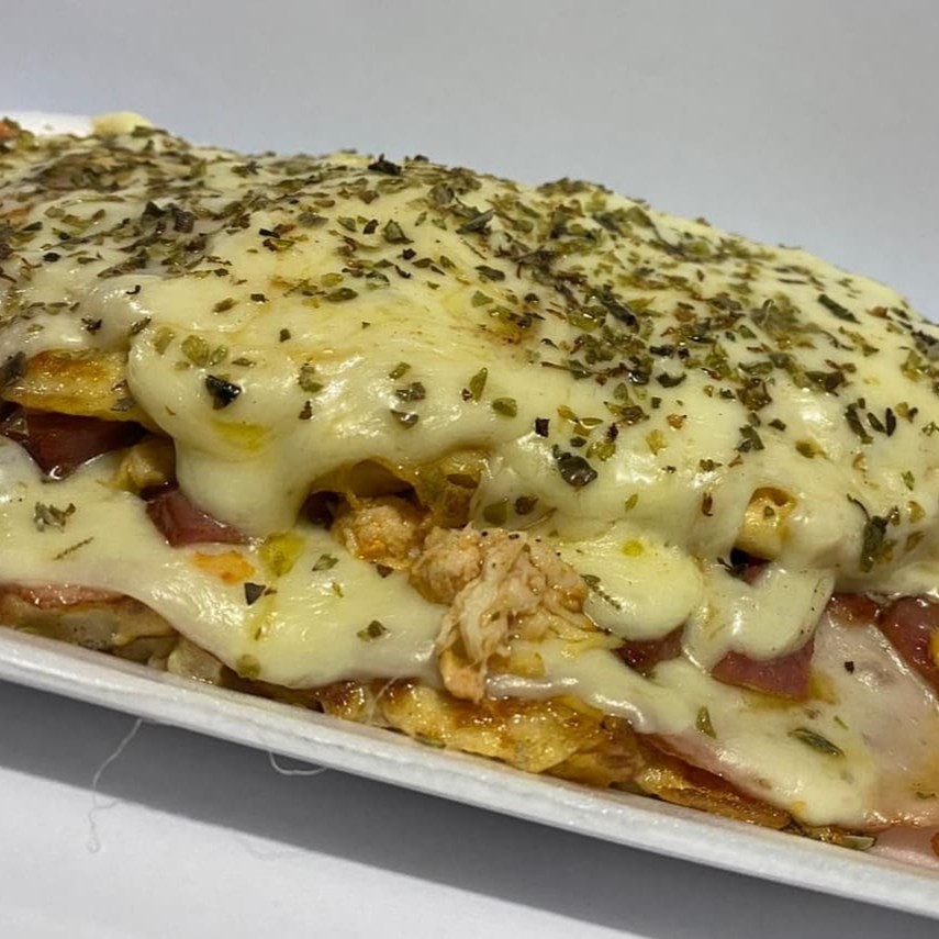 Macarrão, presunto, mussarela, cebola, pimentão verde, tomate, frango desfiado, bacon, calabresa, molho shoyu.