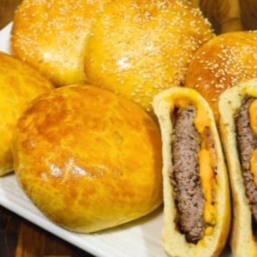 Hamburgão assado, com massa macia e recheio suculento, perfeito para quem busca um lanche completo e delicioso.