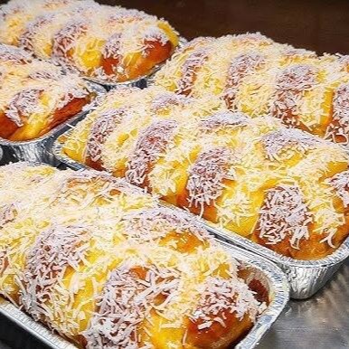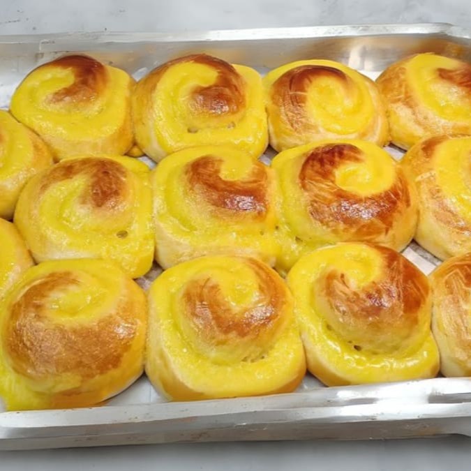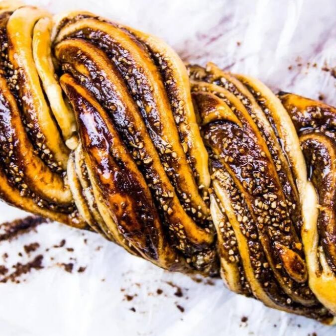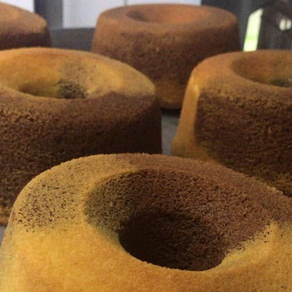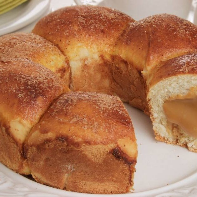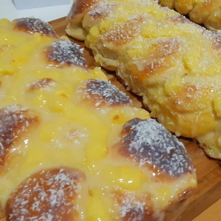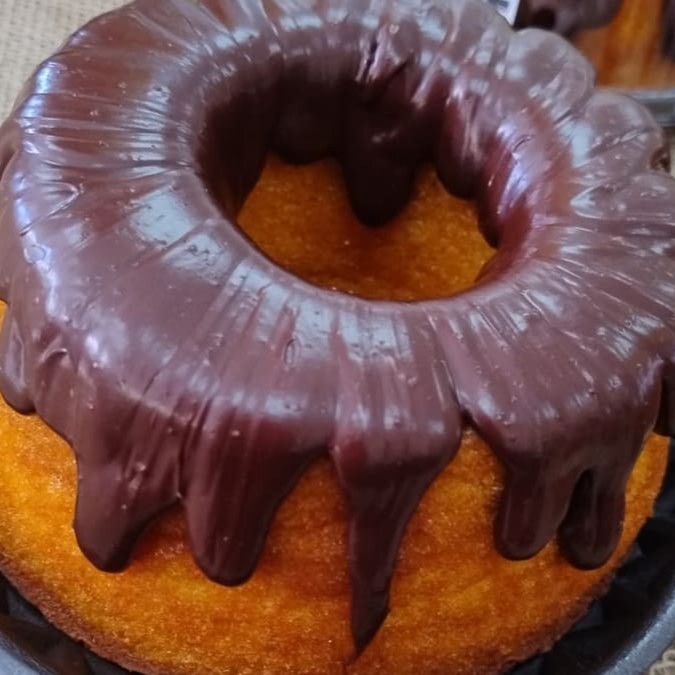 Rosca recheada sabor Prestígio polvilhada com açúcar.