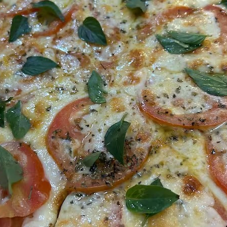 Molho ao sugo, mussarela tomate, manjericão e orégano.