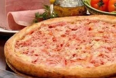 Molho ao sugo, mussarela, presunto, tomate e orégano.