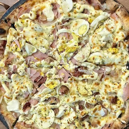 Molho ao sugo,bacon, mussarela, presunto, calabresa,ovos, pimentão, tomate,cebola, azeitona e orégano.
