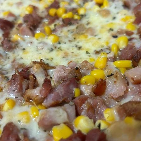 Molho ao sugo, mussarela, bacon,milho e orégano.