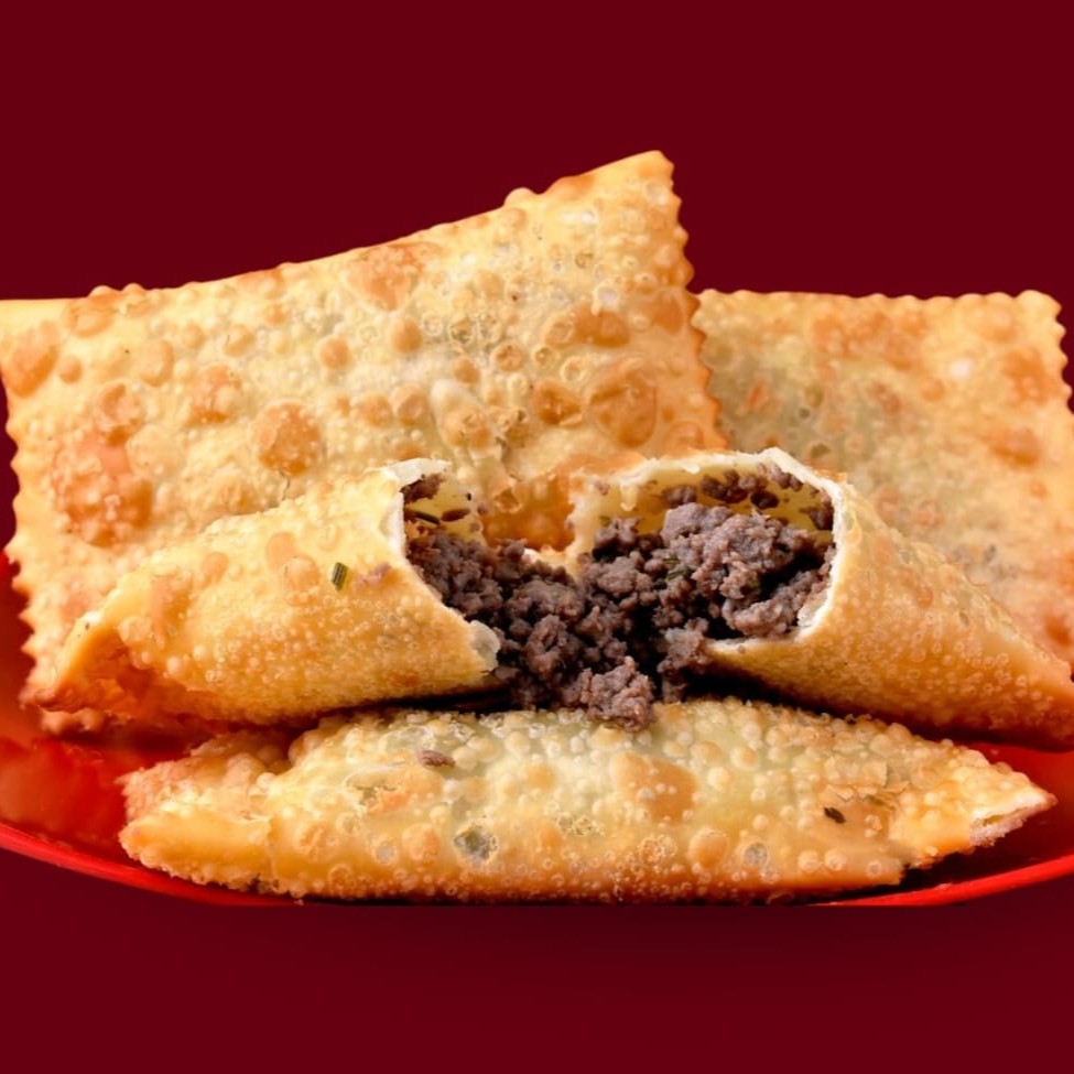 Pastel recheado com carne moída temperada e suculenta, frito até ficar crocante.