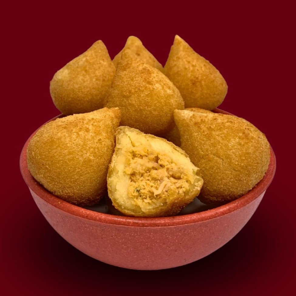 Apresentamos a nossa irresistível Coxinha de Frango Cremoso. Seu exterior é crocante e sequinho, resultado de uma fritura impecável, feita na hora do seu pedido