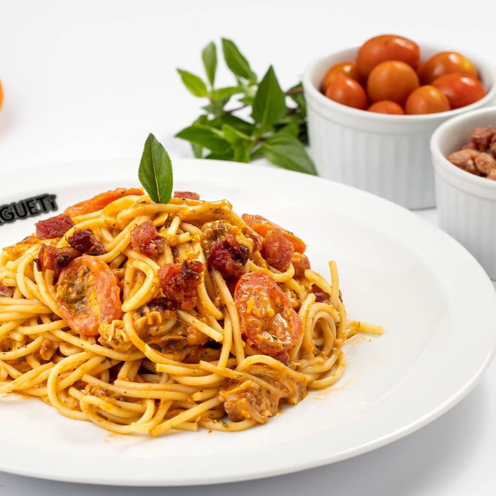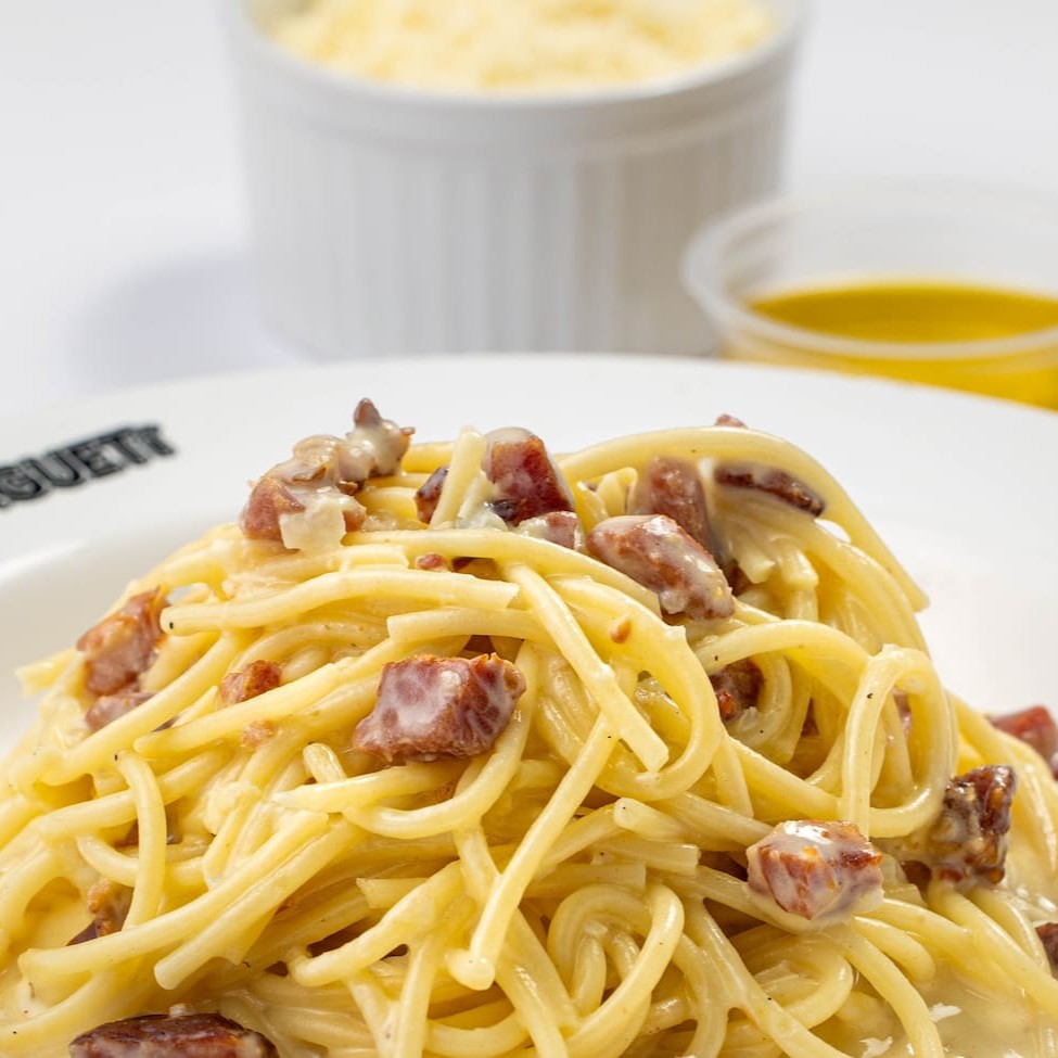 Na simplicidade, se torna perfeito. O Carbonara, com seus ingredientes clássicos, conquistou nossos corações! Espaguete grano duro com molho branco especial, creme de ovos, bacon, cebola e queijo parmesão.