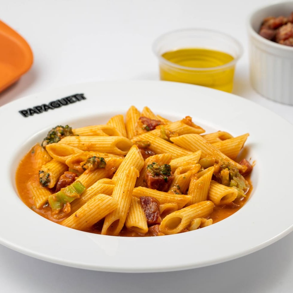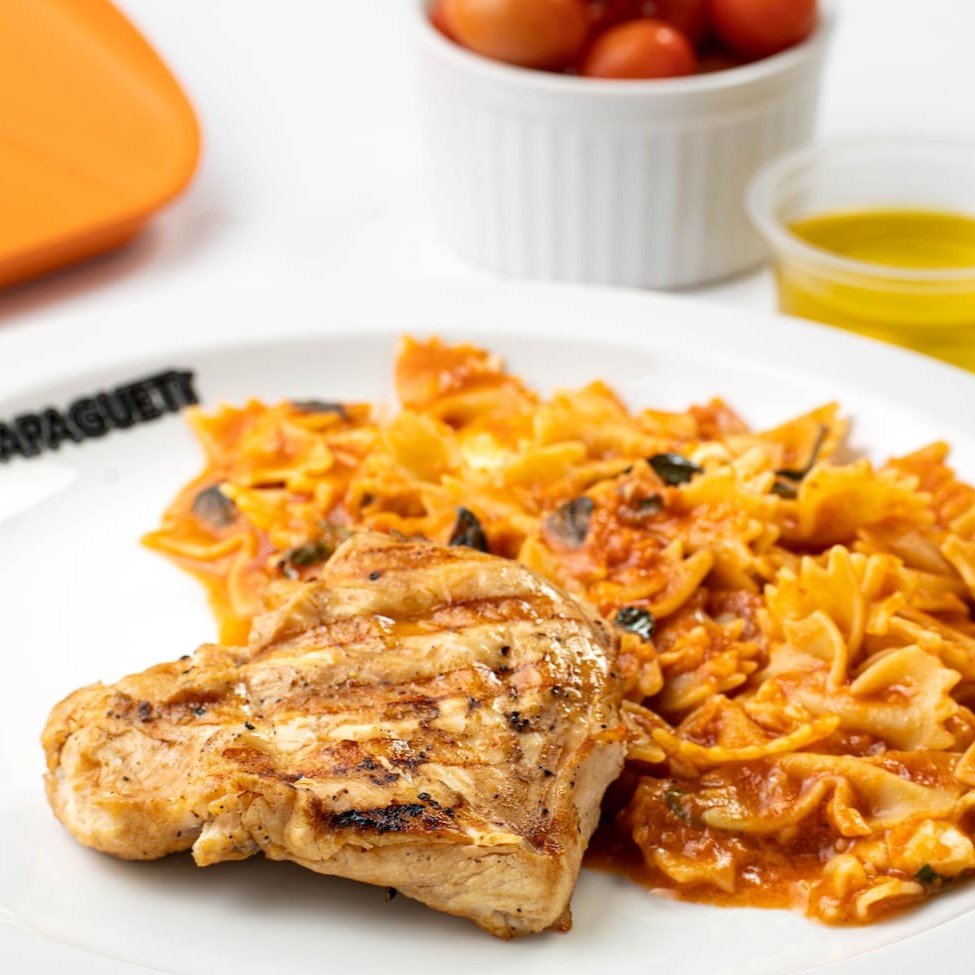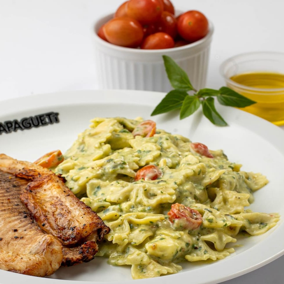 Escolha sua massa. Acompanha azeite extra virgem, alho e cebola refogados, molho pomodoro, queijo canastra, folhas de manjericão e o grelhado da sua preferência. * A cada prato vendido o Papagueti repassa R$ 2,00 para o Instituto Mano Down.