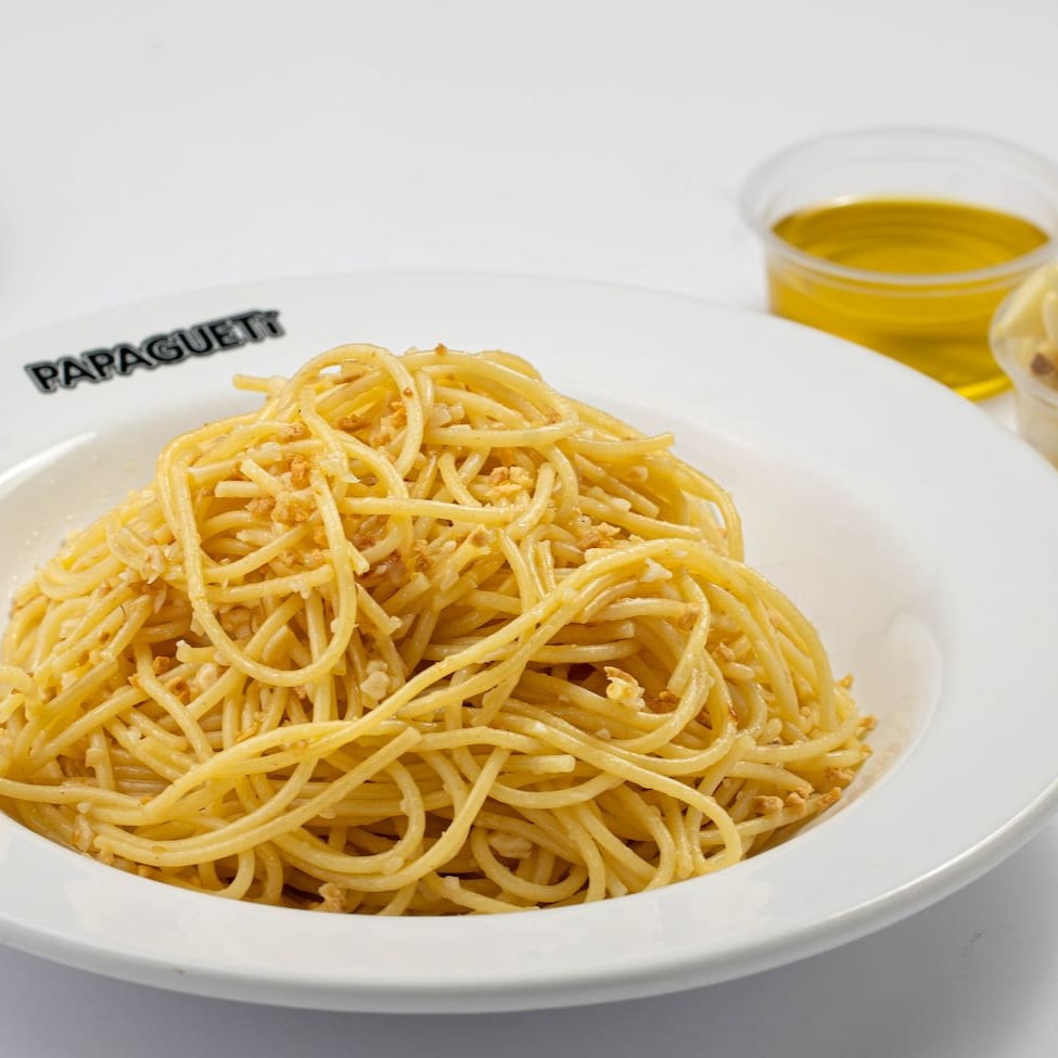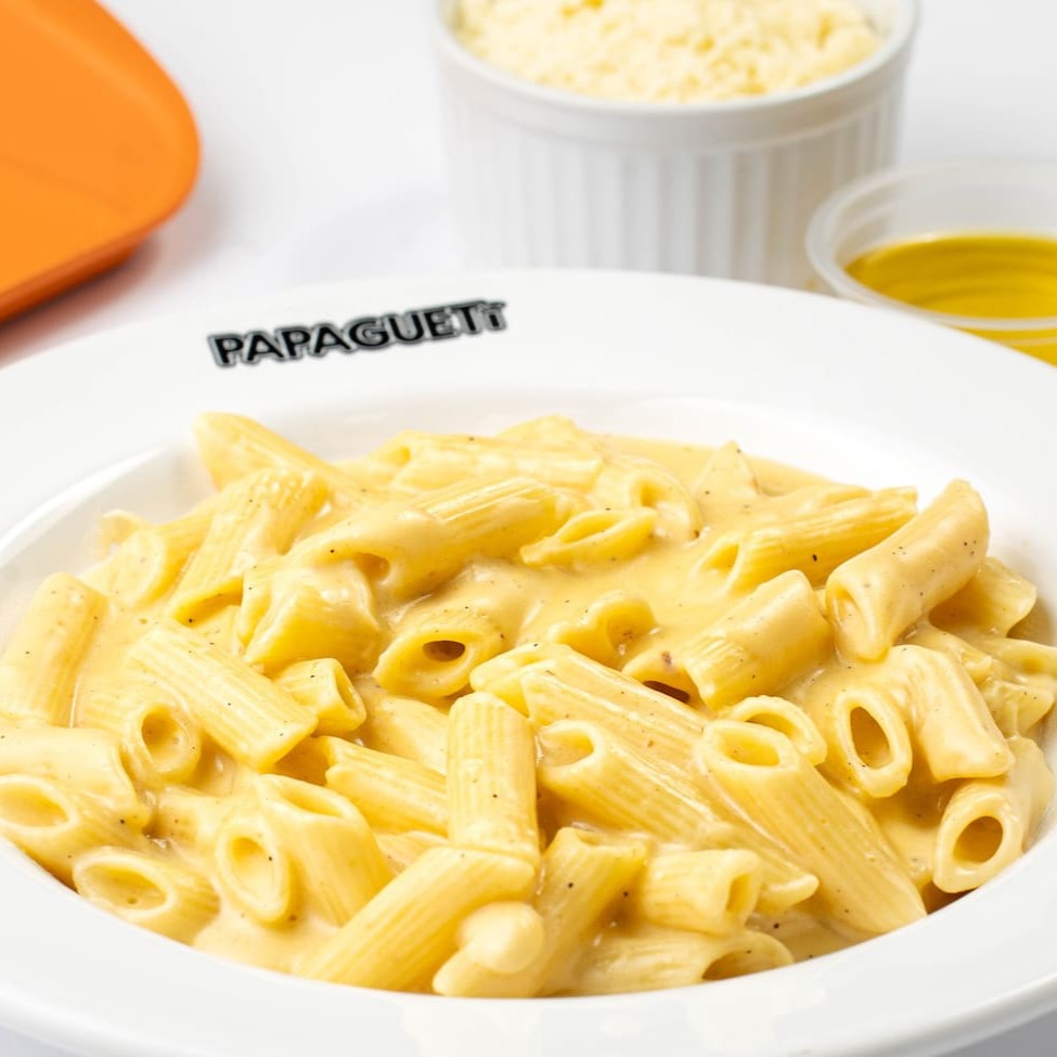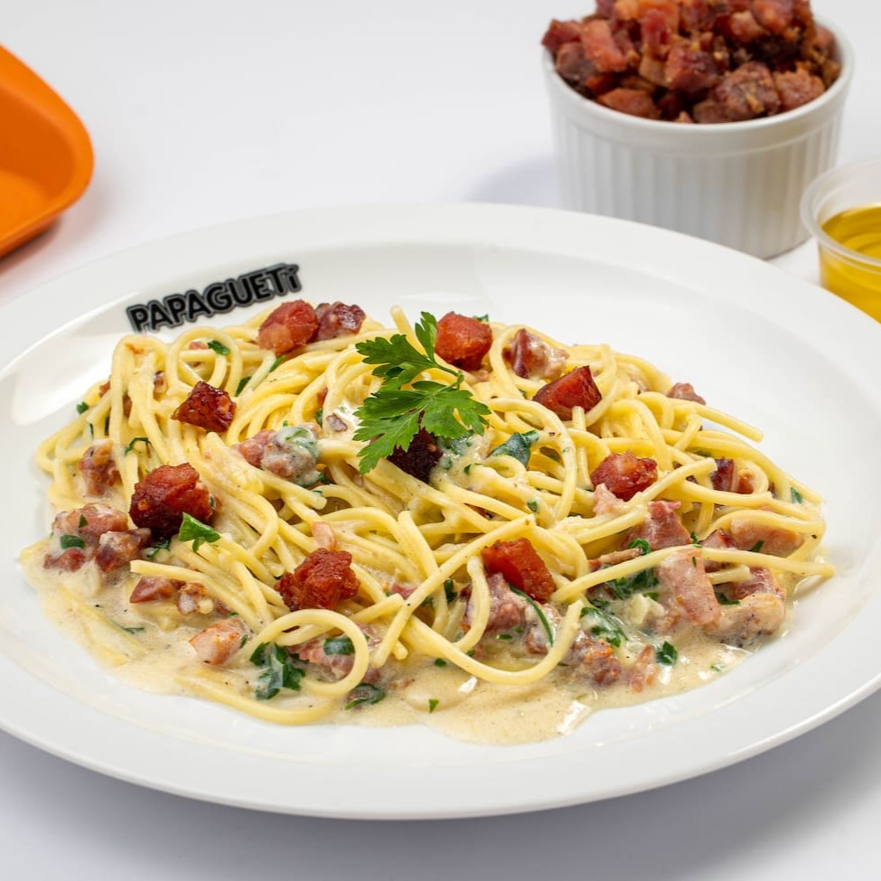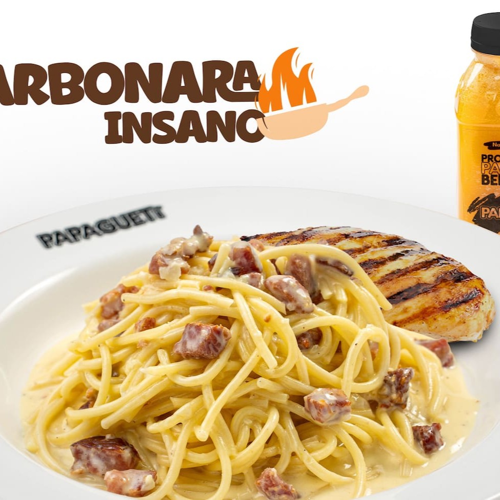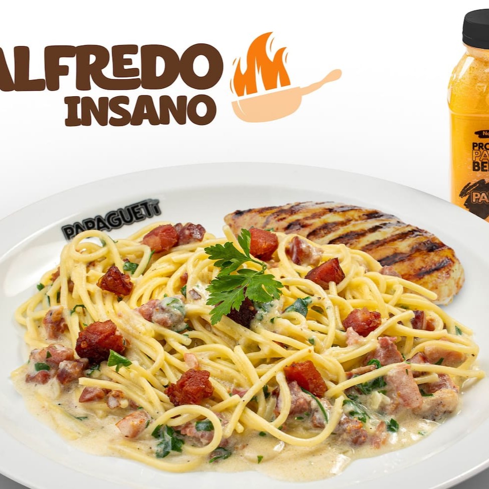 Fettuccine Alfredo? Nãooo, aqui temos o Papagueti Alfredo, sinônimo de brasilidade e bom gosto... Espaguete grano duro com molho branco especial, bacon, cebola e queijo parmesão. Finalizado com salsinha.