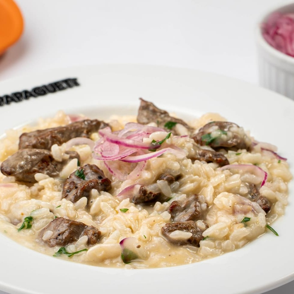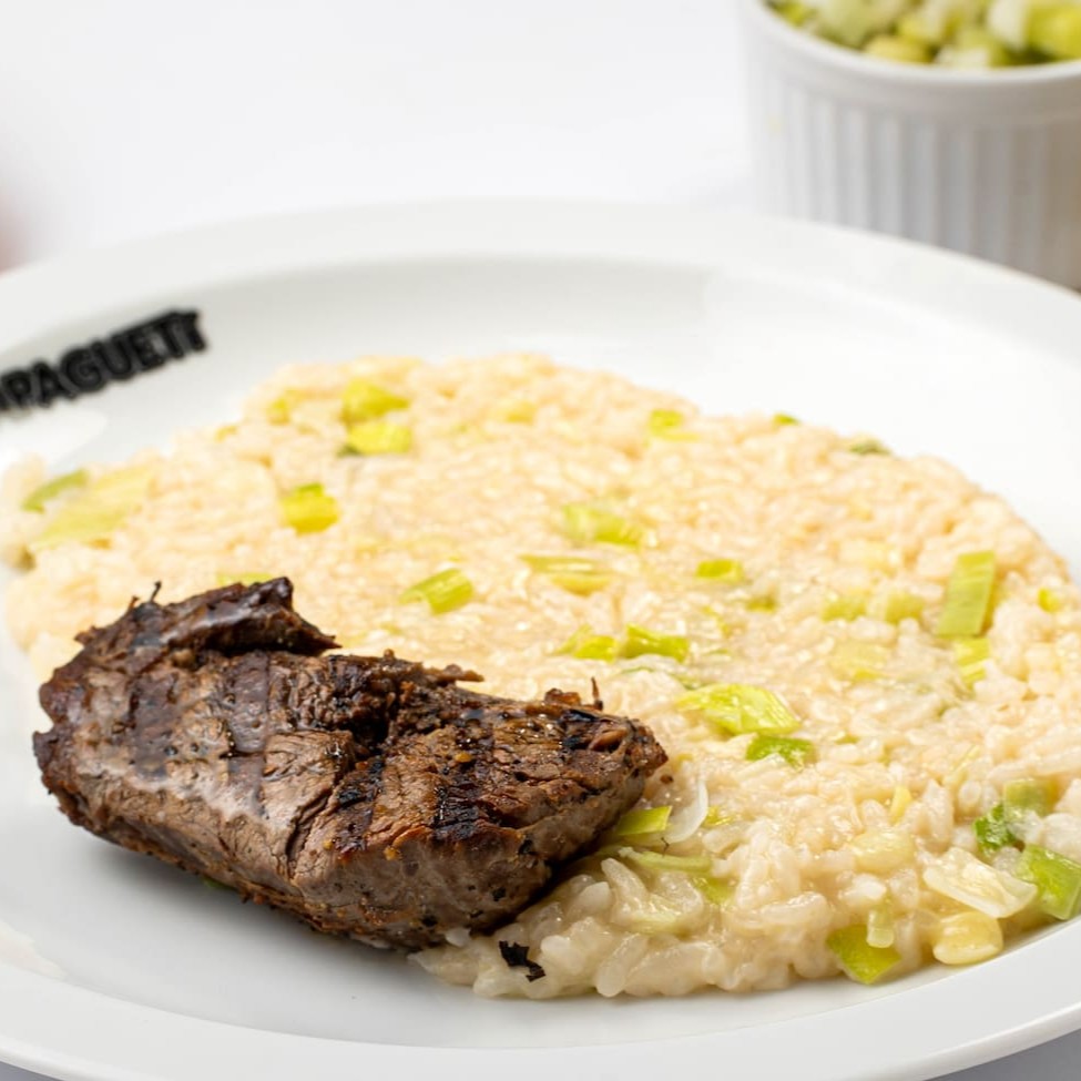 Arroz arbóreo acompanhado de iscas de filé mignon, cebola roxa, salsinha e finalizado com queijo parmesão.