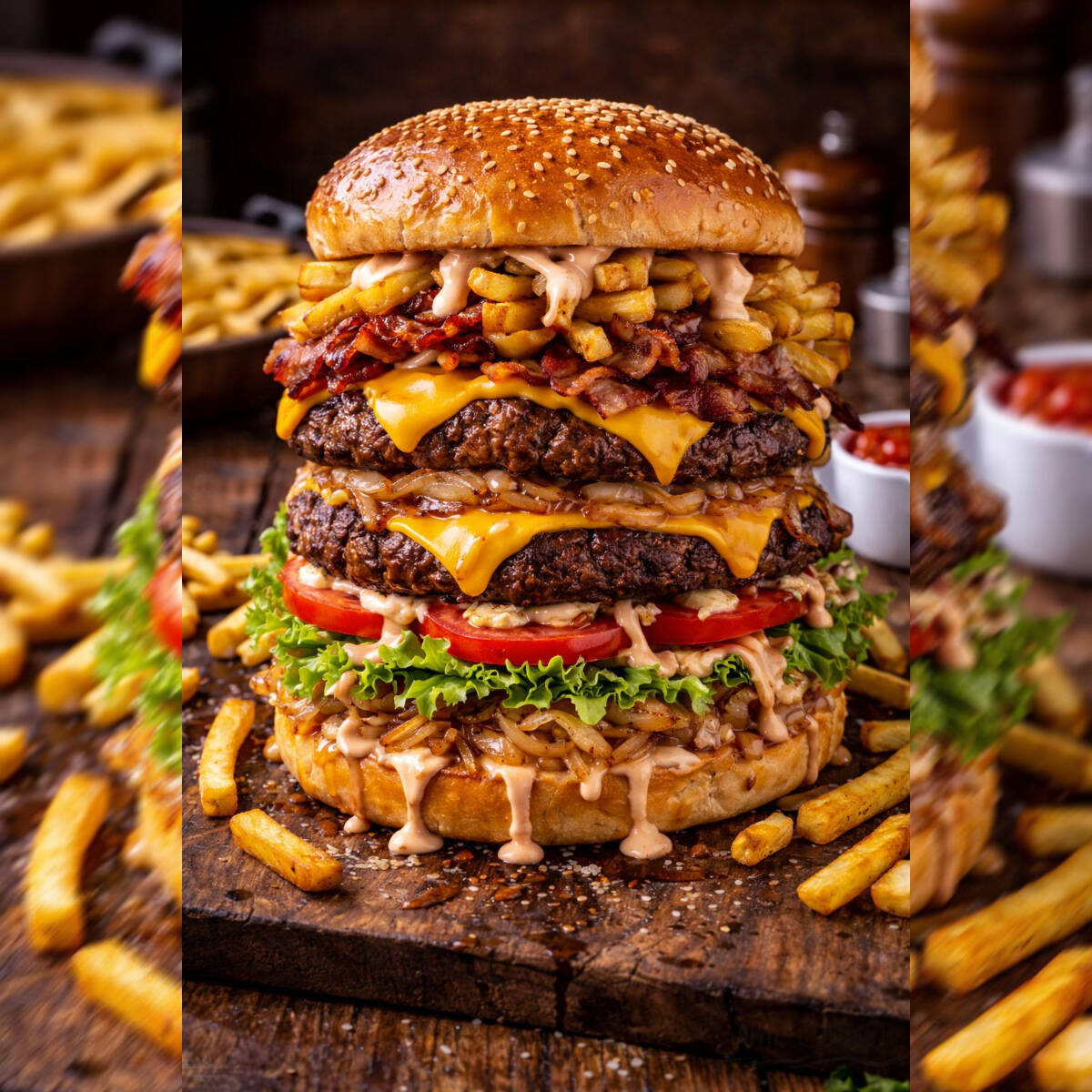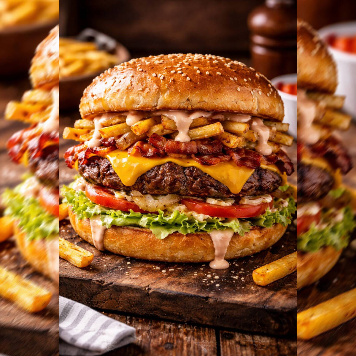 Pão, Carne de Picanha, 2 Carnes de Boi, 2 ovos, bacon, frango desfiado, Presunto, Mussarela, abacaxi, cheddar, alface, tomate Milho, Batata Palha.
