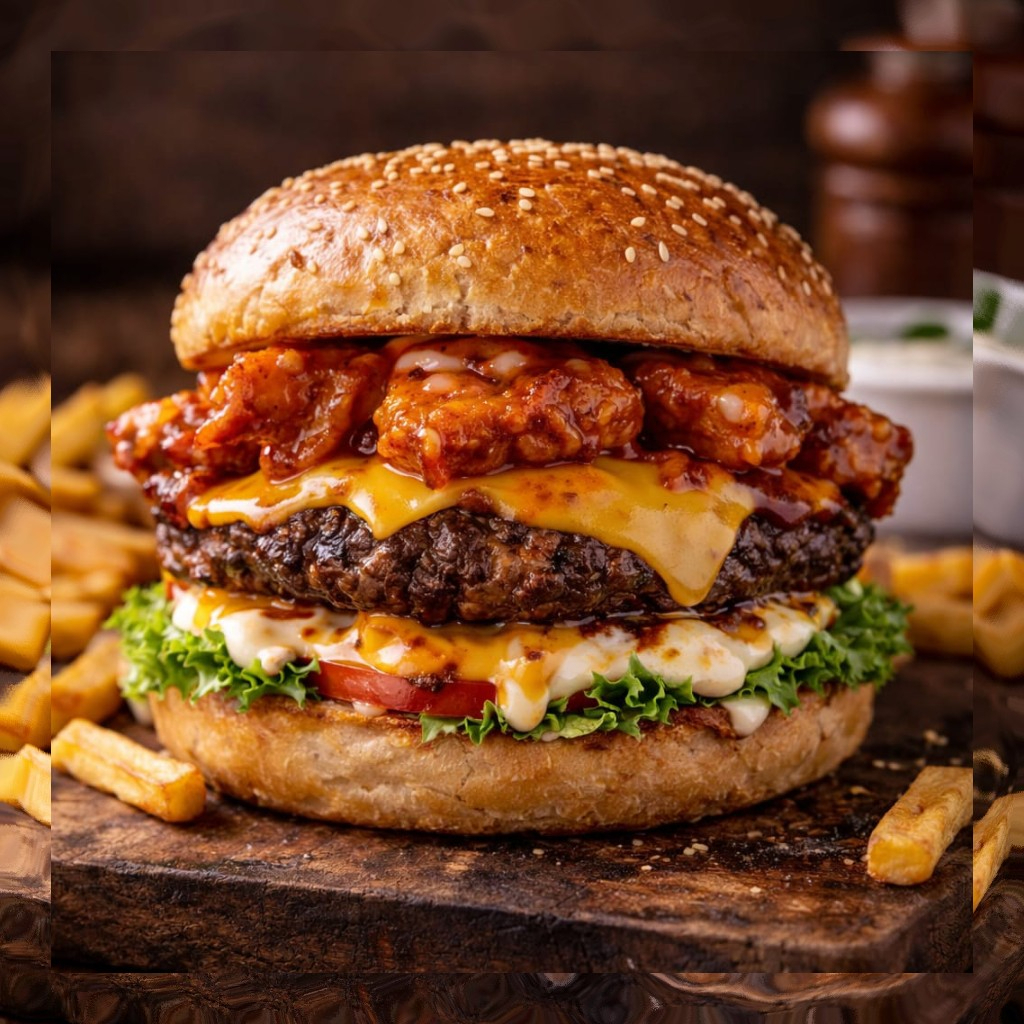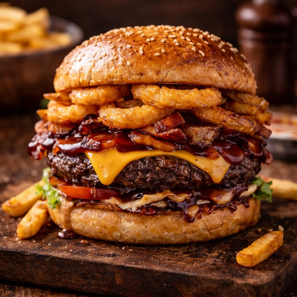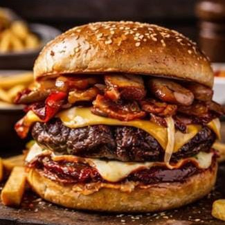Pão, Carne de Hambúrger, Bacon, Mussarela, anel de cebola, cheddar, salada, Milho, Batata Palha