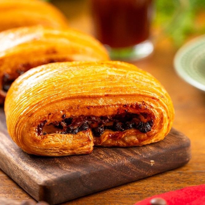Elaborado a partir da massa de Croissant, o Pain au Chocolat conta com a união de duas barritas de Chocolate Belga em seu interior.