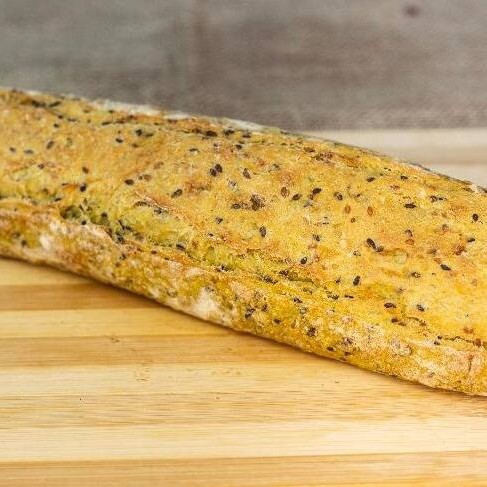 Baguette de Fermentação Natural, elaborada com mix de Grãos levemente condimentada com Curry.