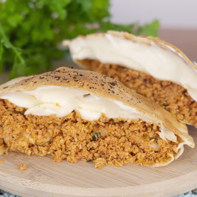 carne moida mais um queijo derretido mais um tempero caseiro.