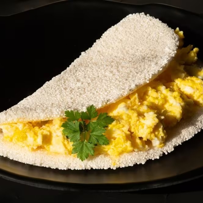 Tapioca com ovo. Acompanha: Ovos mexidos. A tapioca é feita no ato do pedido chegando quentinho e saboroso!!