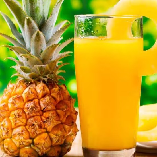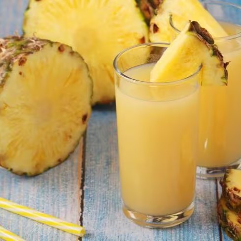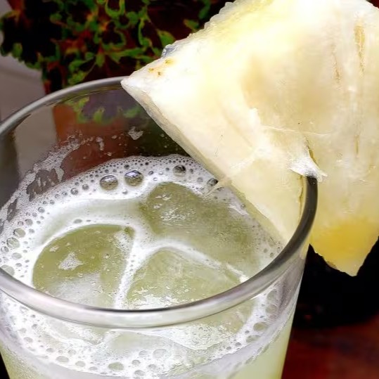 Um suco puro e revigorante de abacaxi servido com gelo para realçar a doçura natural da fruta.