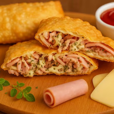 Massa tradicional recheada com carne Mussarela, presunto e orégano para finalizar com aquele gostinho de pizza