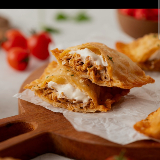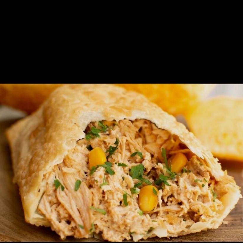 _Massa crocante recheada com frango temperado. Uma escolha saborosa e suculenta para qualquer hora do Dia!_