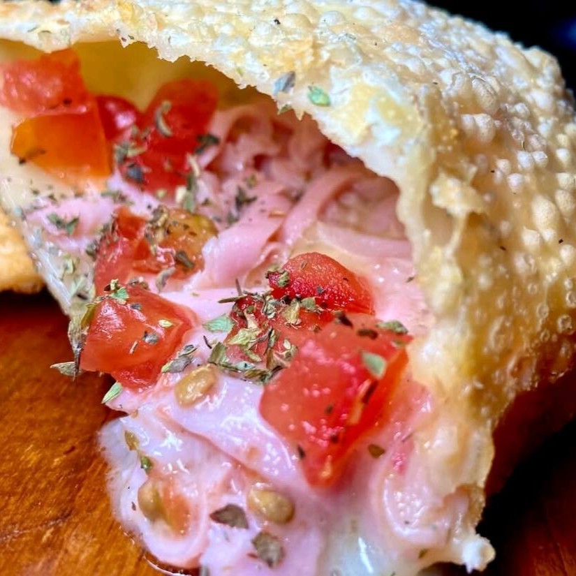 Pastel de pizza delicioso*: _Massa crocante recheada com queijo, presunto, tomate e orégano. Sabor de pizza em formato de pastel, perfeito para qualquer momento!_