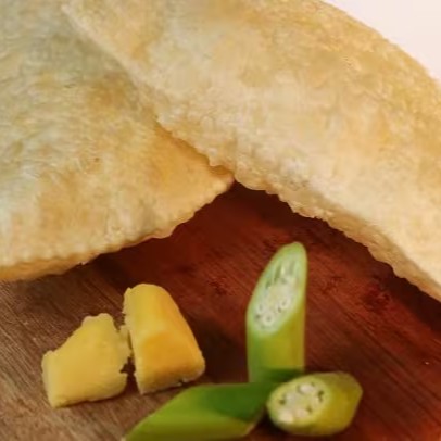 Pastel tamanho médio de frango com quiabo.