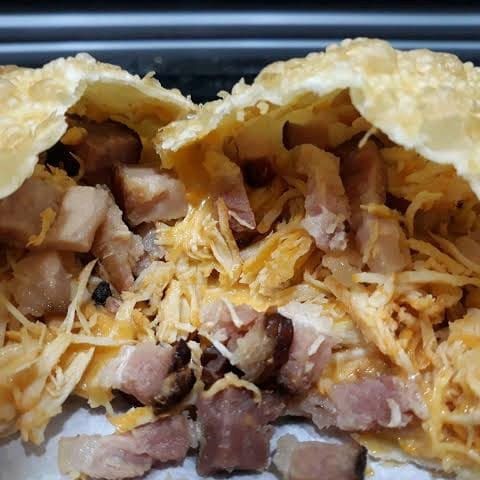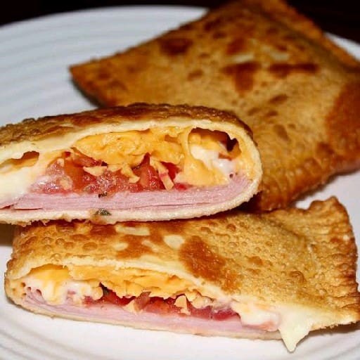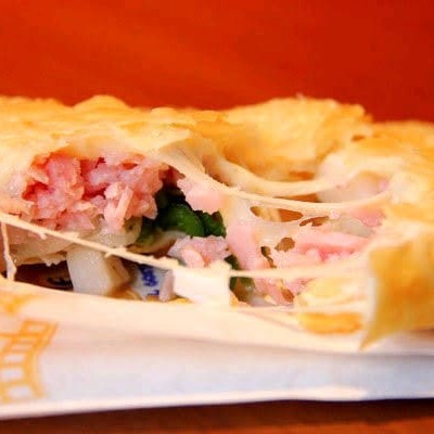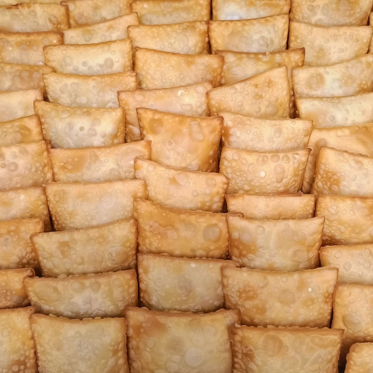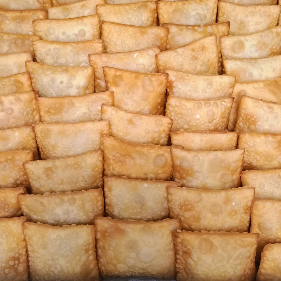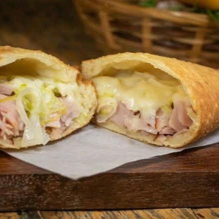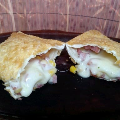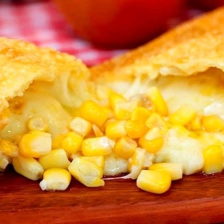Presunto, mussarela, orégano, cebola, tomate, cheiro verde, milho e Catupiry. Pastel com 20cm.