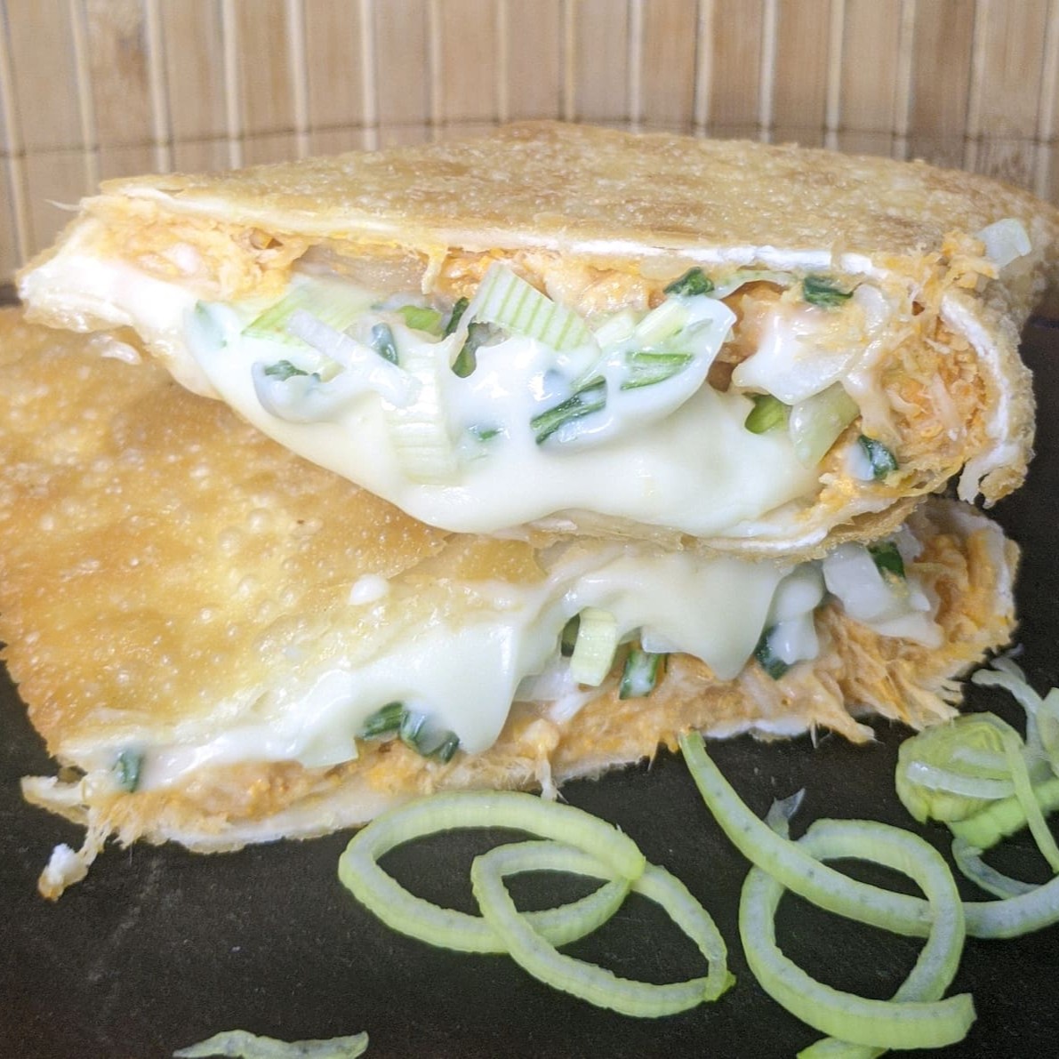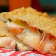 Frango desfiado, cebola, cheiro verde, tomate, mussarela e Catupiry. Pastel com 20cm.
