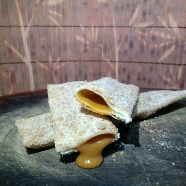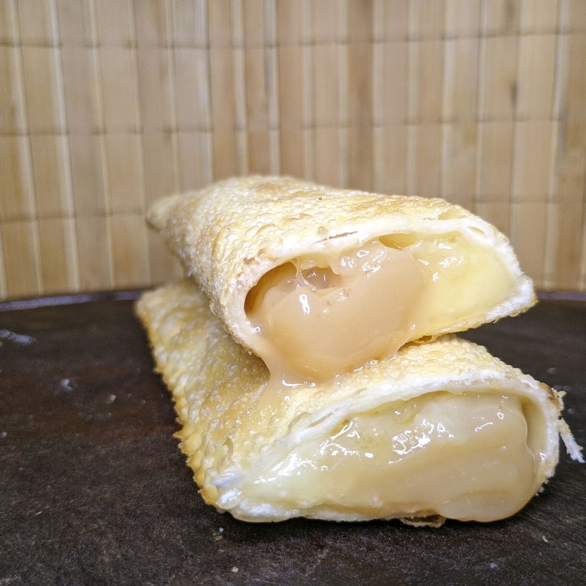 Pastel formato de tubinho, recheio de doce de leite com queijo, aproximadamente 17cm