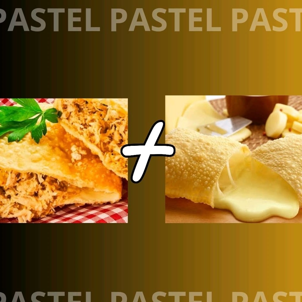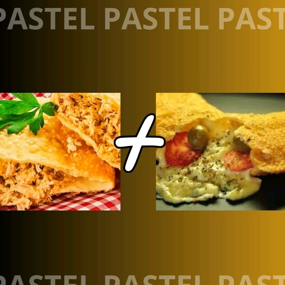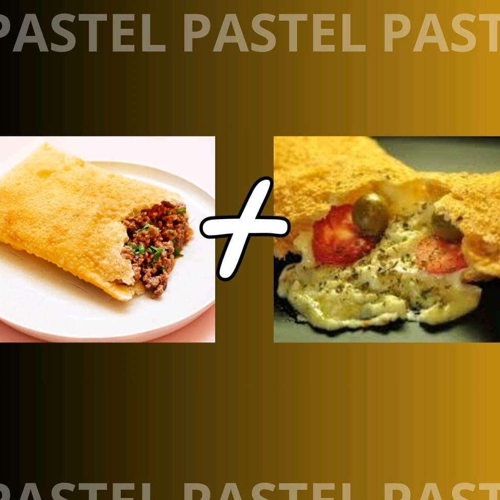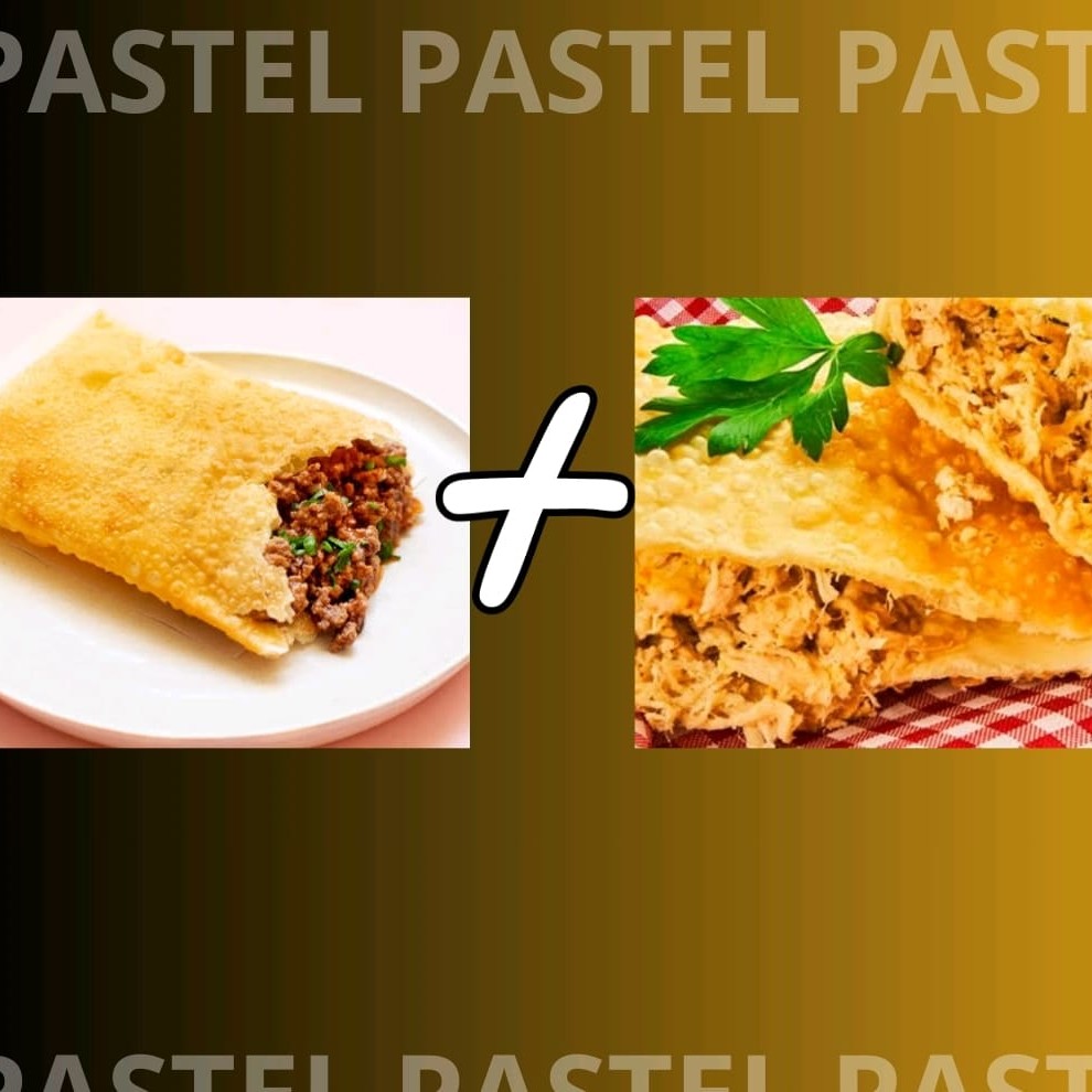 Pastel meio a meio de Carne que acompanha carne moída, cebola e cheiro verde + Pizza que acompanha presunto, mussarela, tomate, milho e orégano. Tamanho médio de 20cm