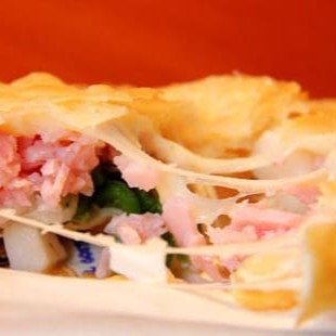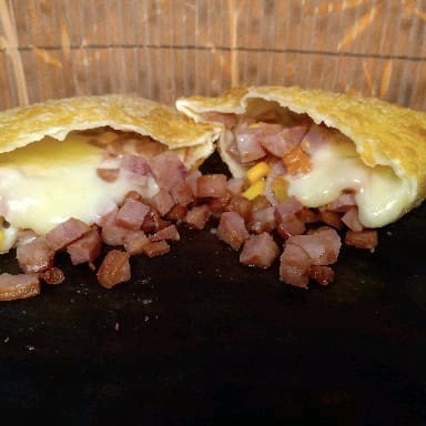 Presunto, mussarela, orégano, cebola, cheiro verde, tomate, milho e Cheddar Cremoso. Pastel com 20cm.