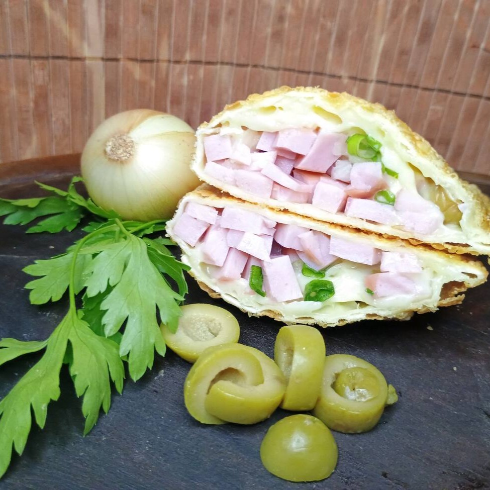 Pastel de 20cm c/ lombo canadense, mussarela, azeitona, cebola, cheiro verde fresco, 120gr a 160gr.