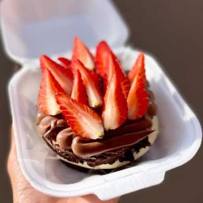 Nosso brownie e feito com dois discos de brownie bem chocolatudo, recheio de Ninho, um toque de nutella e finalizado com morangos frescos