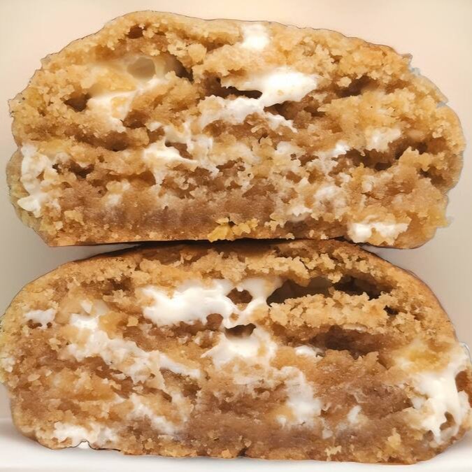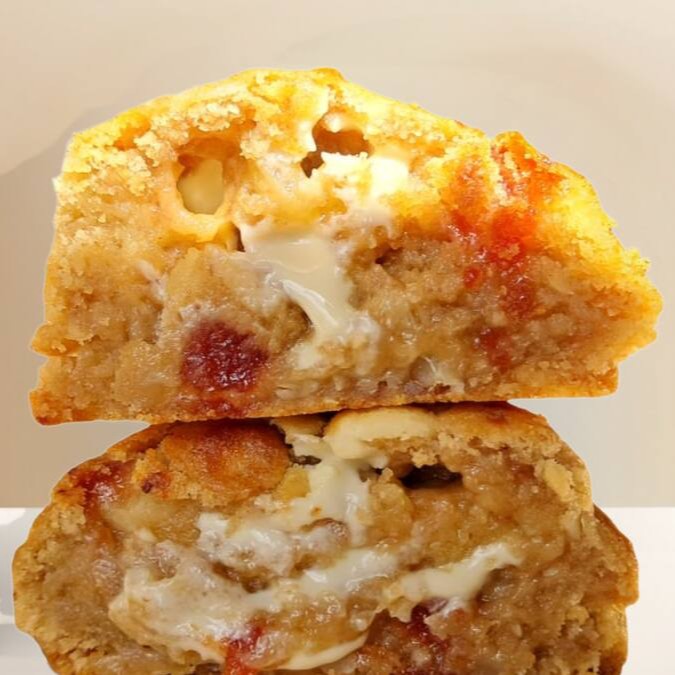 Delicioso cookie amanteigado de Romeu e Julieta. São 90 gramas, com massa amanteigada com toques de parmesão, pedaços de chocolate branco nobre e goiabada! A combinação perfeita para os mineiros!