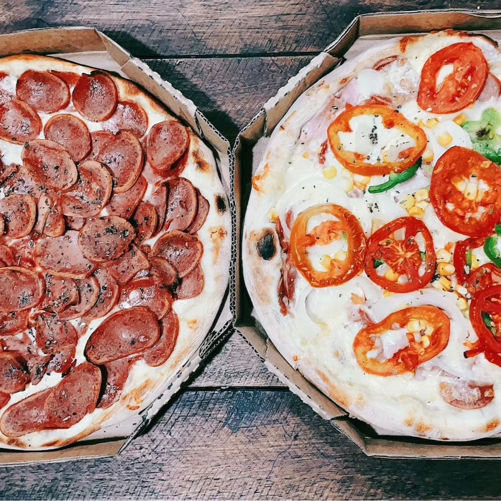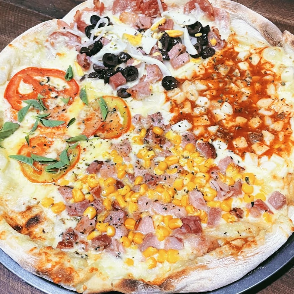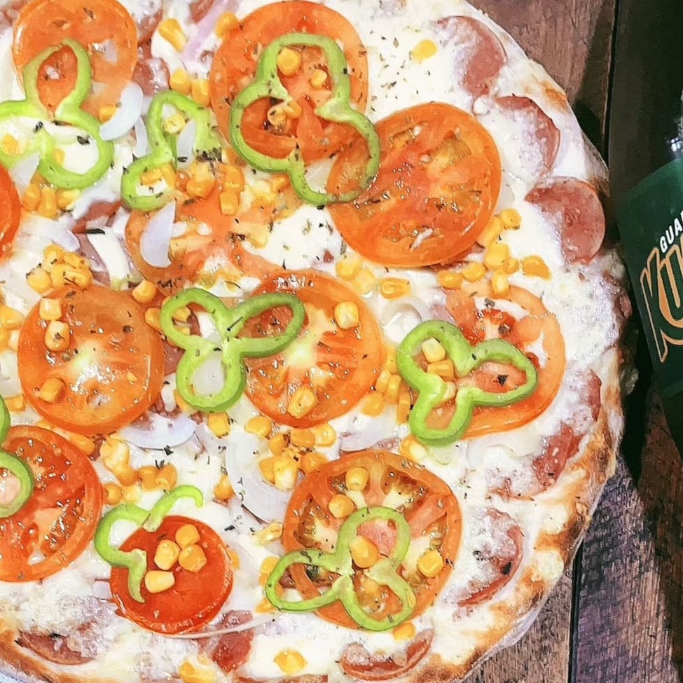 Mussarela, molho, calabresa, pimentão, cebola, presunto, milho, tomate e oregáno