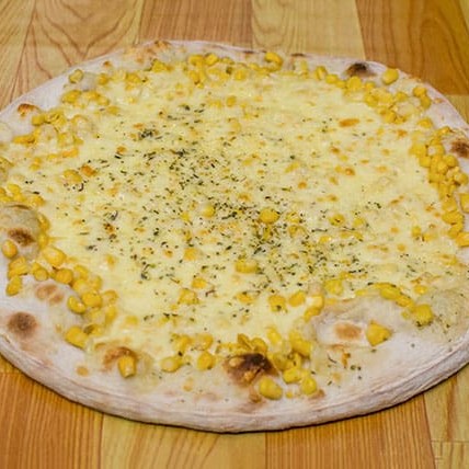Molho de tomate, milho, requeijão cremoso, mussarela e orégano,