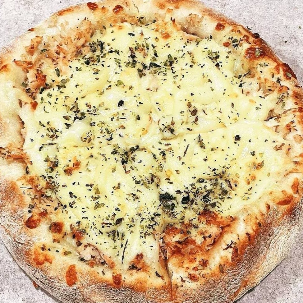 Mussarela, molho ao sugo, frango desfiado, Catupiry e orégano.