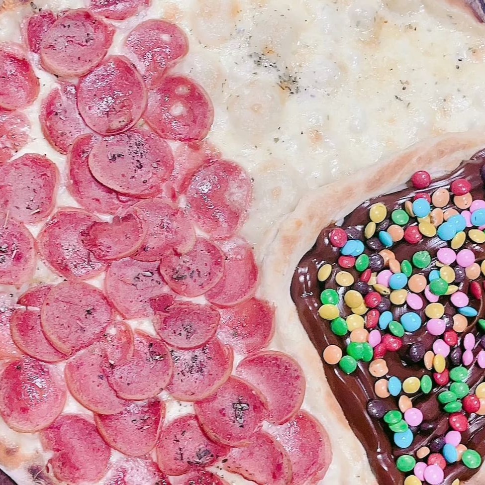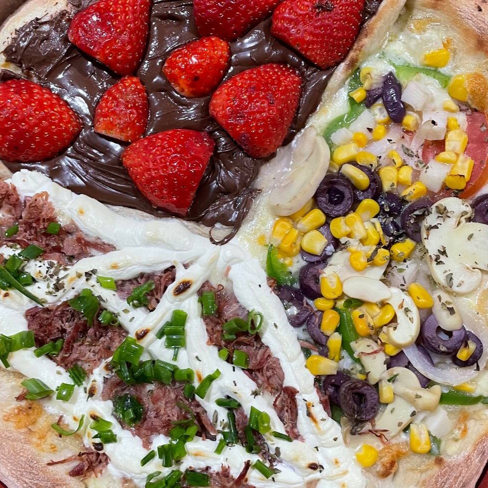 4 fatias de calabresa (molho sugo, calabresa, mussarela e oregáno, 2 fatias de chocolate (creme de leite, chocolate e Confete) e 2 fatias de mussarela (molho sugo, mussarela e oregáno)