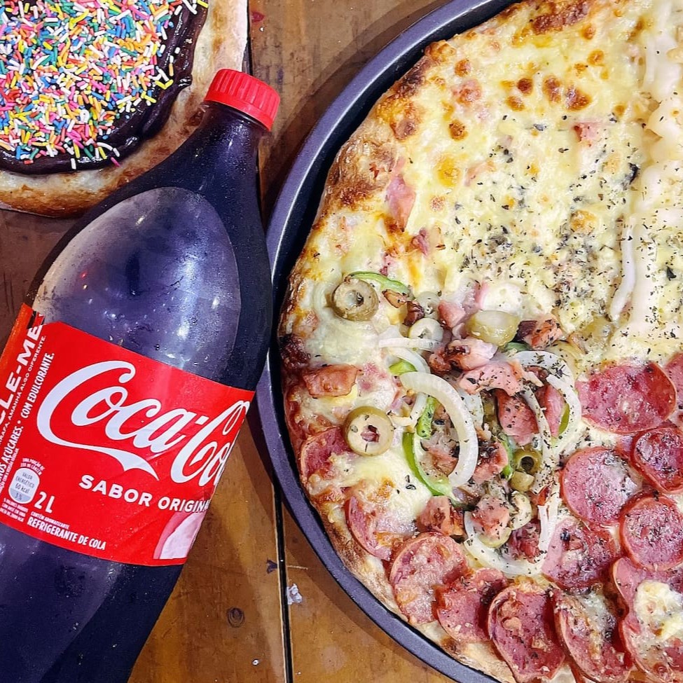 1 pizza gigante35cm - 8 fatias - 4 sabores ( 2 fatias de frango Catupiry, 2 fatias moda, 2 fatias calabresa, 2 fatias presunto) + 1 pizza broto 20cm - 4 fatias - chocolate com granulados coloridos + 1 Coca Cola 2lt tradicional