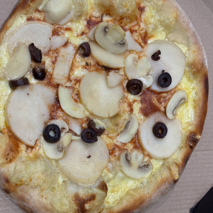 Molho de tomate, palmito, champignon, azeitonas pretas, mussarela e orégano.