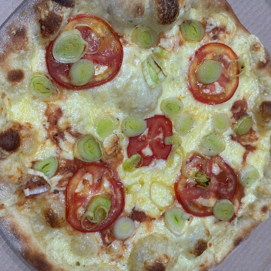 Molho de tomate, alho poró, tomate, mussarela e orégano.