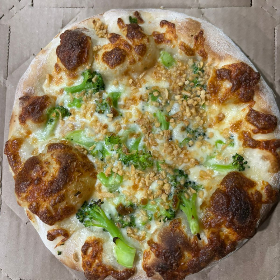 Molho de tomate, brócolis, alho frito, mussarela e orégano.