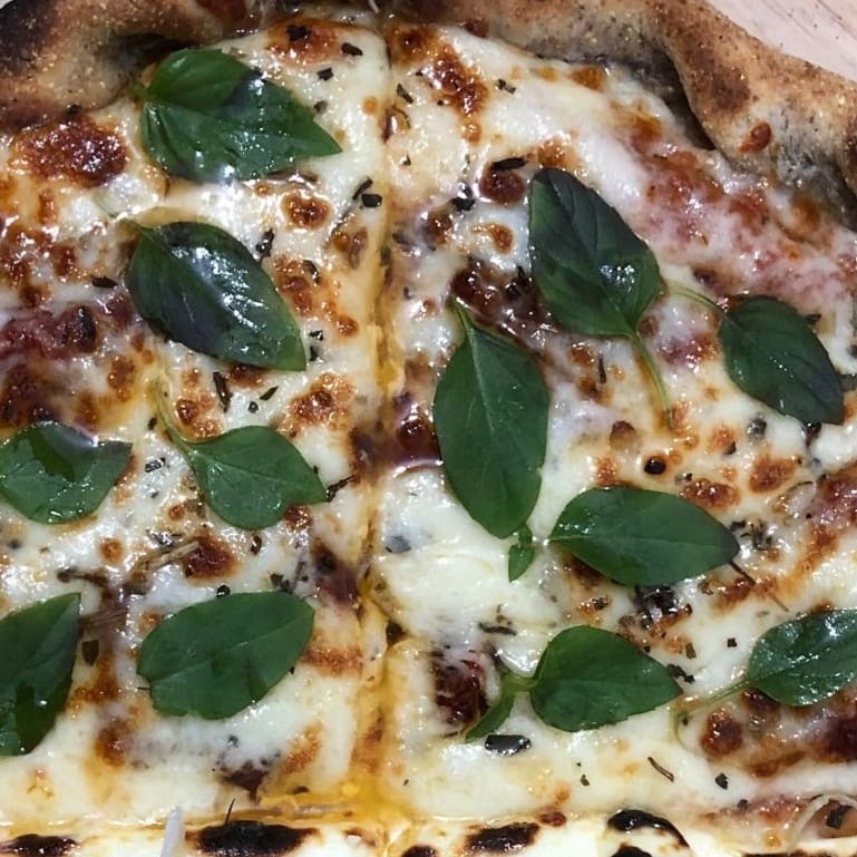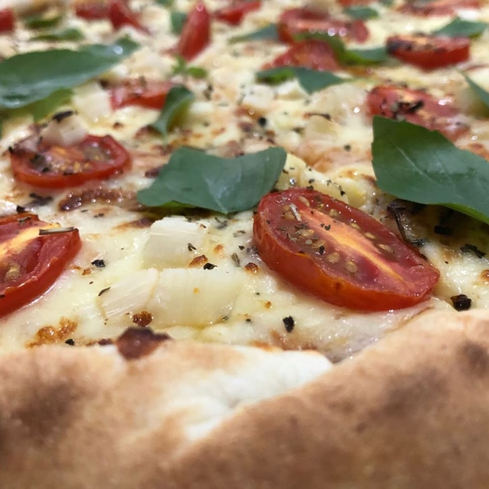 Massa artesanal, presunto, mussarela, molho ao sugo e oregáno.