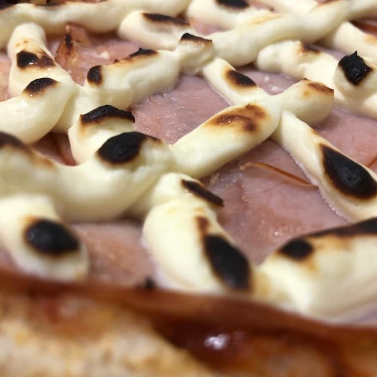 Massa artesanal, presunto, mussarela, molho bolonhesa e oregano.