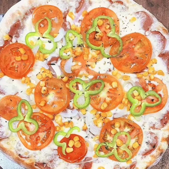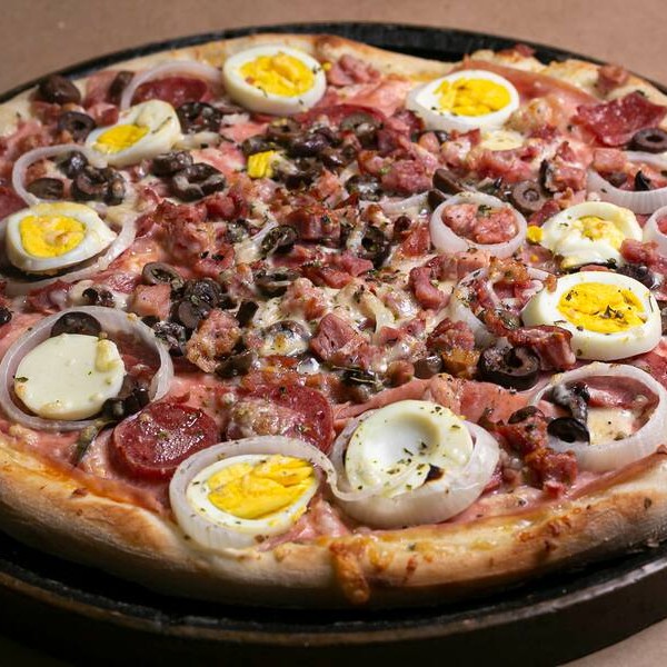 Massa leve e crocante, com molho de tomate suave, mussarela derretida e uma explosão de sabores: tomate fresco, cebola, pimentão, azeitonas verdes, palmito, milho e orégano.
