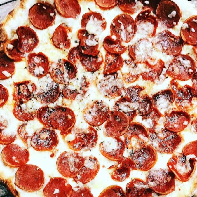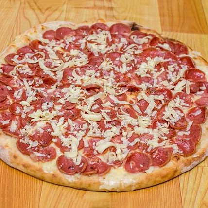 Mussarela, molho ao sugo, calabresa e orégano. 35 cm. 8 fatias.